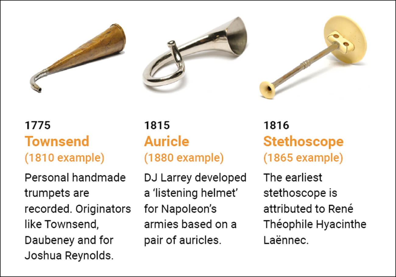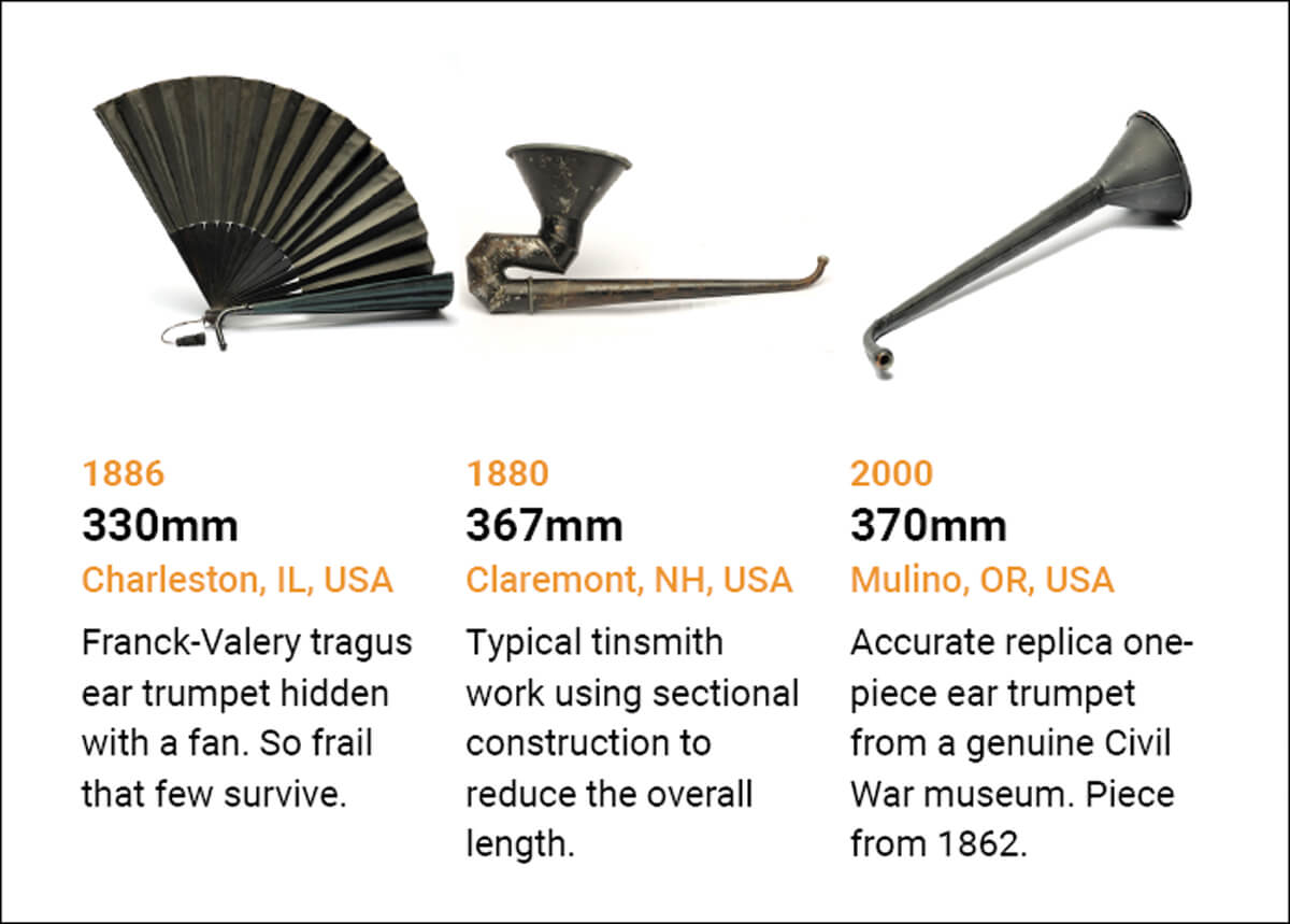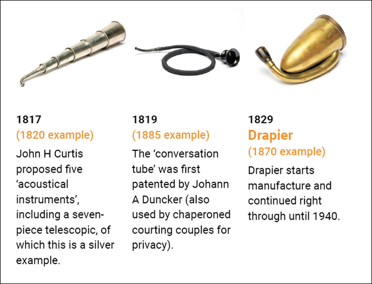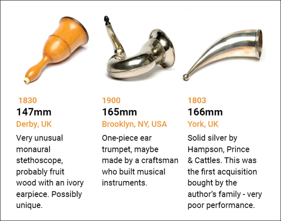 I researched antique ear trumpets and soon discovered that, in addition to a simple tapered horn, one could buy antiques in the form of a double parabola London Dome or Banjo, or even a metre-long conversation tube. Samples were quickly acquired, and the world-class Packington Collection was started. My collection is predicated on the realisation that a huge variety existed in the historical implementation of ear trumpets. The illustrations in this article are taken from items in the collection.