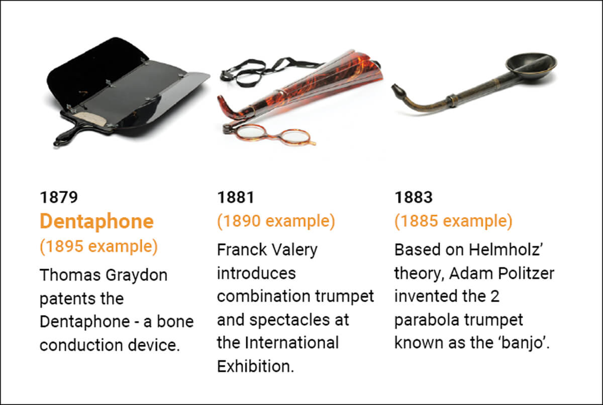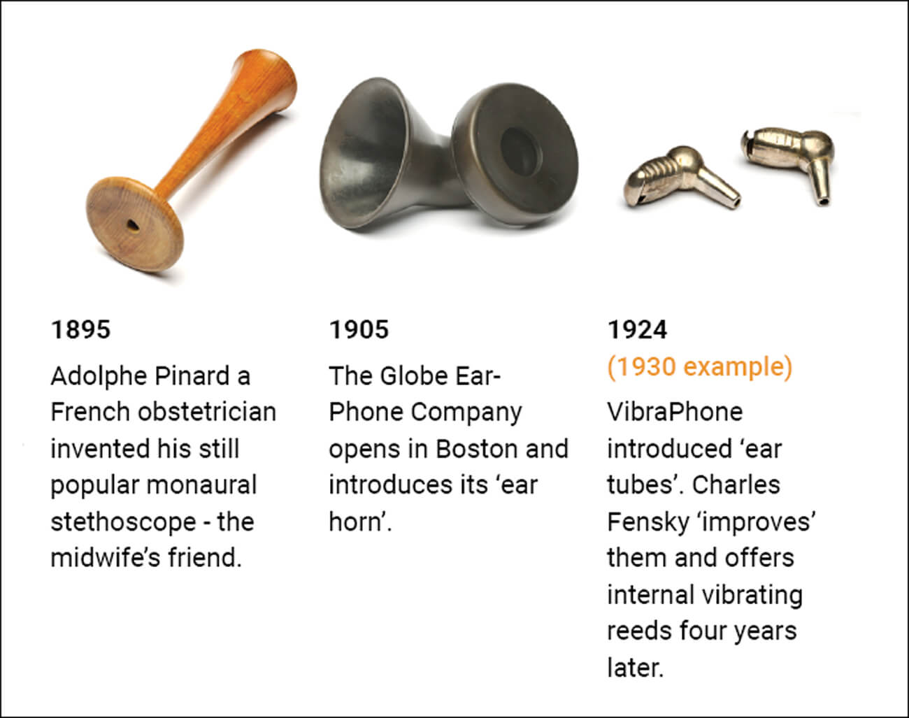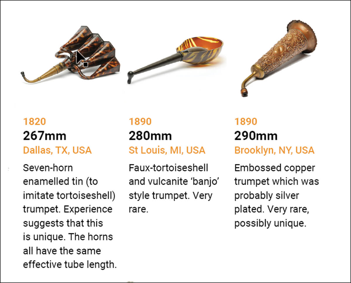 I researched antique ear trumpets and soon discovered that, in addition to a simple tapered horn, one could buy antiques in the form of a double parabola London Dome or Banjo, or even a metre-long conversation tube. Samples were quickly acquired, and the world-class Packington Collection was started. My collection is predicated on the realisation that a huge variety existed in the historical implementation of ear trumpets. The illustrations in this article are taken from items in the collection.