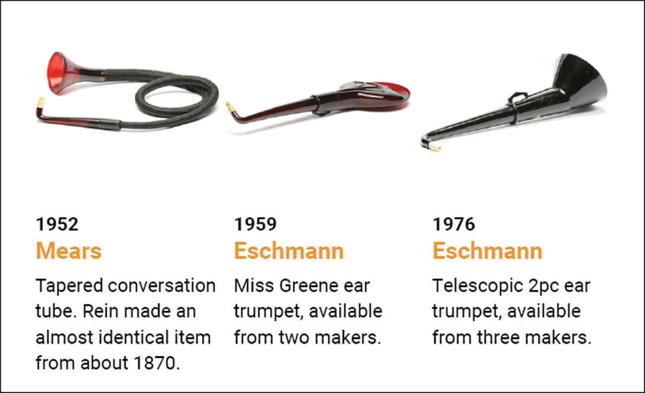Mass production of the ear trumpet surged then dwindled in the early 20th century, but a few makes held on until the 50s. In 1948, the UK National Health Service (Medresco) introduces a range of at least six different ear trumpets designs, most of which are datemarked. Eschmann tapered conversation tubes were made in the UK right up to 1976, although the design was virtually unchanged from the early commercially produced examples in the 1880s.