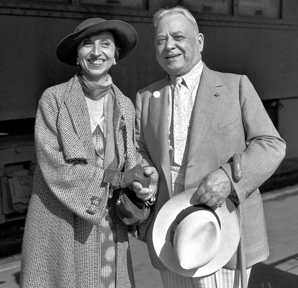 LE Behymer greets Amelita Galli-Curci, opera singer, upon arrival at the railway station., Los Angeles, 1935.