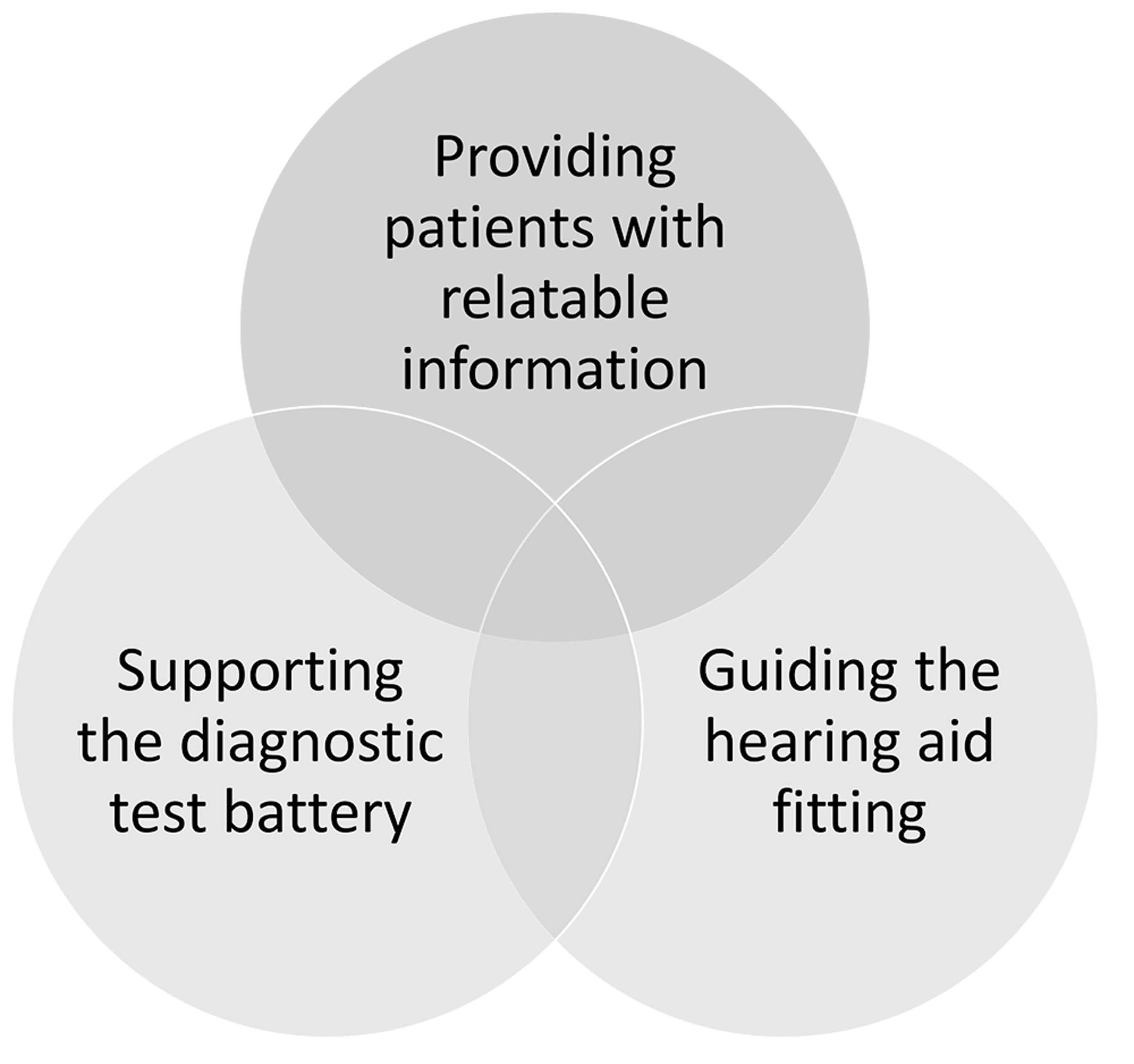 UK HHPs reported a range of benefits of speech testing, summarised in Figure 2 [13]. When providing patients with information about their hearing loss, HHPs reported that using speech testing helped convey the message in a more relatable way, compared to explaining the audiogram alone. Speech testing was also reported as being beneficial pre and post hearing aid fitting, and to assist hearing aid fine tuning. Finally, HHPs reported speech testing to be an important part of specific diagnostic test batteries (e.g. auditory processing disorder, non-organic hearing loss, and cochlear implant candidacy).