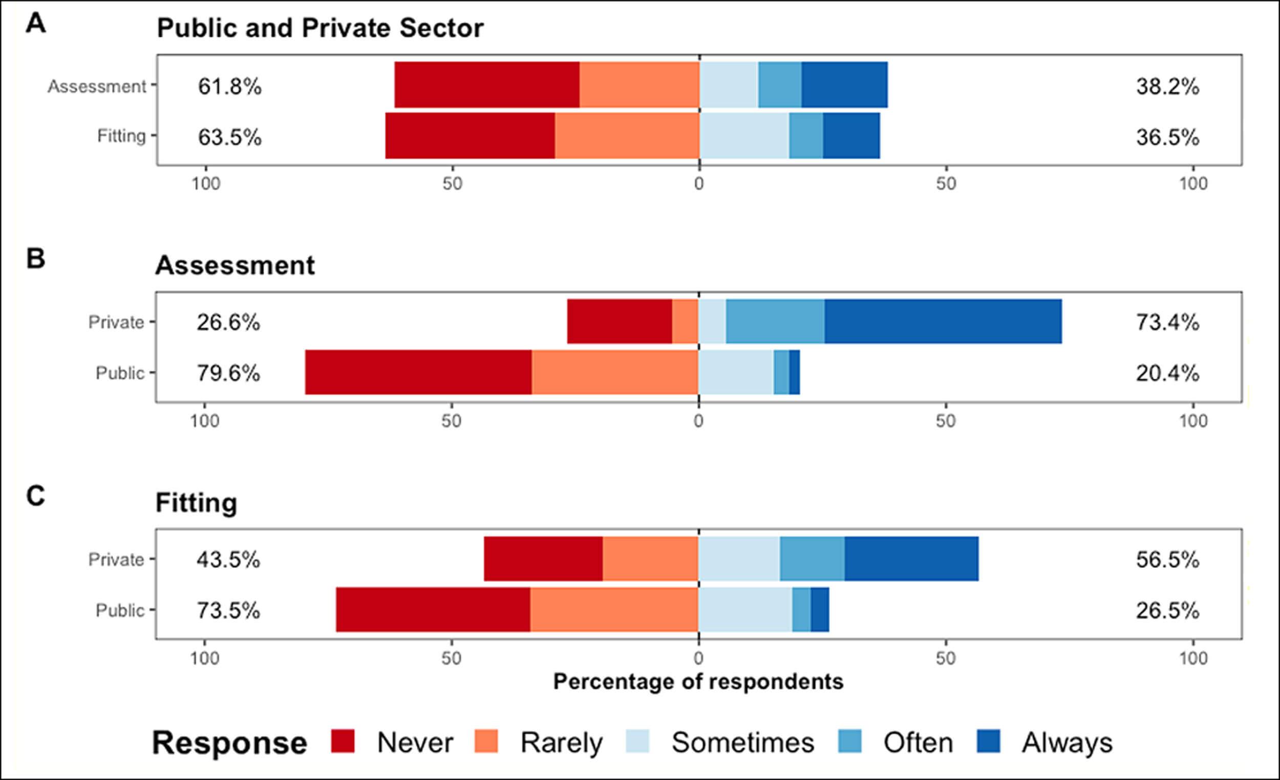 Use of speech testing by HHPs in the UK reflects the global pattern of variable use. In the UK in particular, public-sector HHPs reported relatively infrequent use of speech testing during the clinical assessment and HA fittings of adult patients (Figure 1). Private sector audiology practices in the UK demonstrated a pattern of uptake more closely resembling the US and Canada.