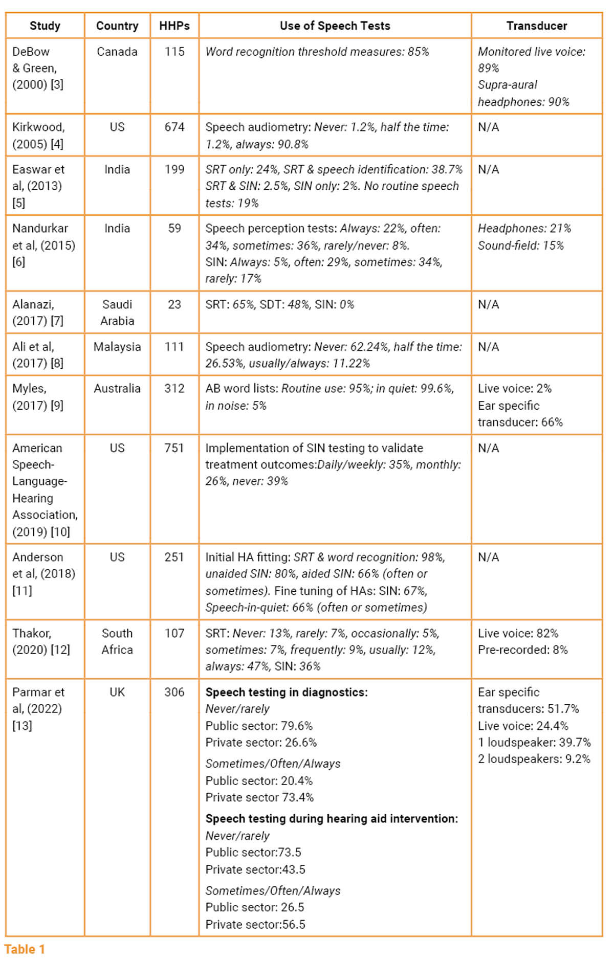 In our recent publication, we (a) collated global speech testing practice patterns from the literature and (b) collected data from UK HHPs through an online survey. A summary of this data is presented in Table 1.