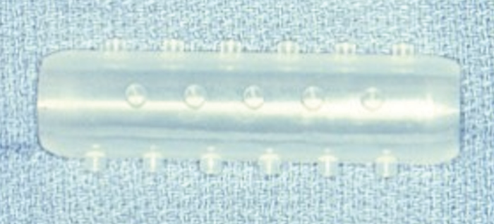 The Rutter stents (Figure 1) are soft and deformable and do not interfere with placement of the tracheostomy tube. They tend to incite less granulation tissue at the distal end of the stent, as the distal end is rounded and smooth. The proximal end of the stent is trimmed to the level of the false vocal cords and then plugged with a rounded cap that is less likely to induce epiglottic granulation tissue. There is a corresponding restriction of speech, as they permit only very limited air passage. While the stent is primarily designed for insertion during LTR, it may also be placed endoscopically. The stent is secured with a Prolene suture passing through the strap muscles on one side of the neck, through the trachea and the stent, and then out the strap muscles on the other side of the neck. The suture is then passed back through a piece of angiocath to prevent the suture cutting through soft tissue, and loosening, and secured with multiple throws to aid in later removal. These soft silastic suprastomal stents are typically placed for four to six weeks, but may be placed for up to six months if required.
