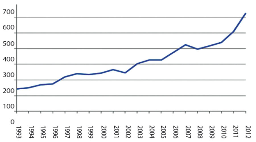 The volume of work on tinnitus published has certainly increased, and Figure 1 illustrates this by demonstrating the number of papers on PubMed published each year in the last 20 years, which has risen from just under three per week in 1993 to 12 per week in 2012/3. Whilst some of this can be attributed to an increase in scientific publication in general, and to developments in otology and audiology specifically, the breadth and depth of the literature being published is heartening, including as it does papers in higher profile, and higher impact factor journals than previously ([1-3] for example).
