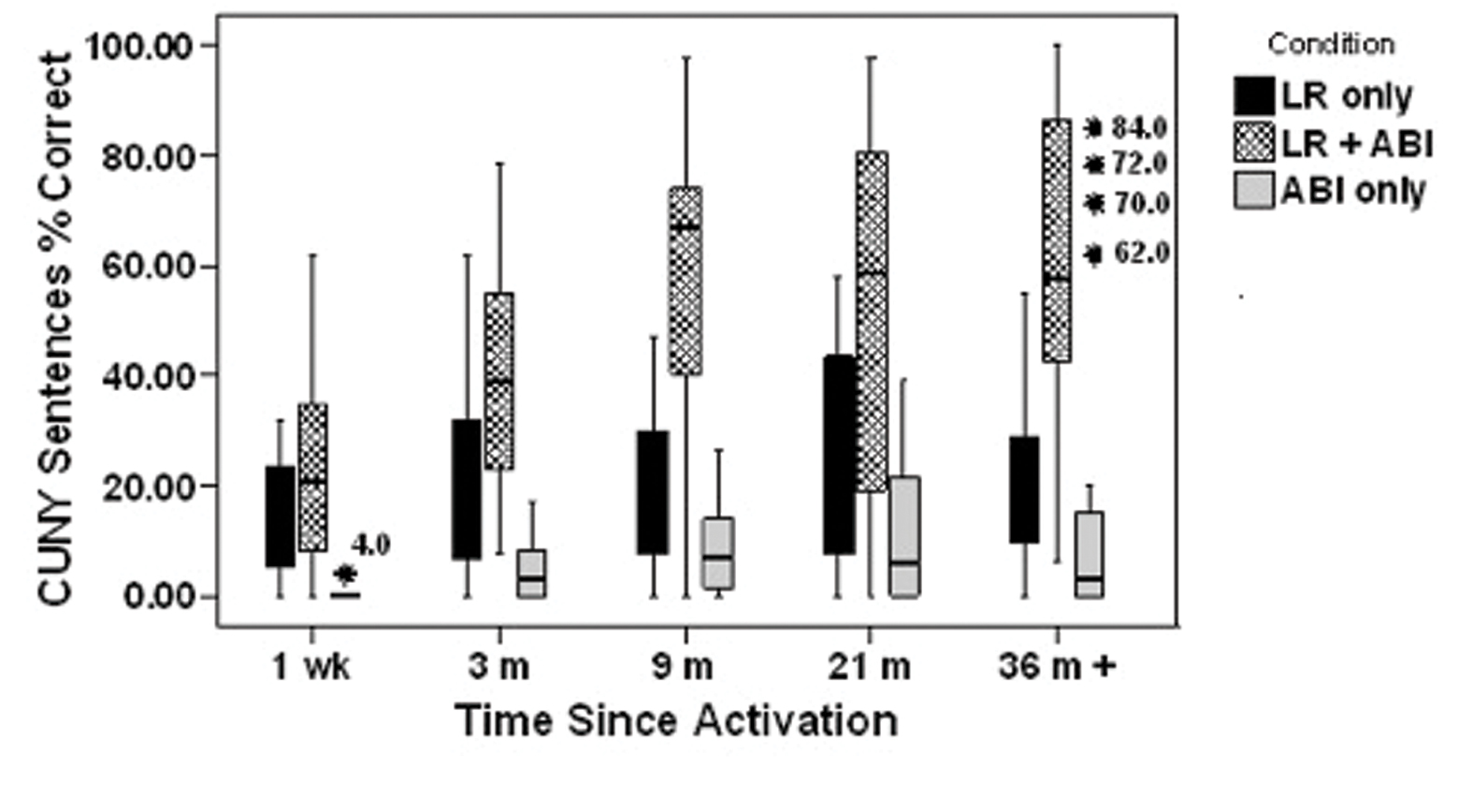 Figure 4: CUNY sentences discrimination in three conditions: lipreading (LR) alone, LR and auditory brainstem implant (ABI) together and ABI alone in adults and older children (n = 31). Boxplots indicating median value with inter-quartile range and the upper and lower range of measures except for outliers more that 1.5 box lengths from the box edge.