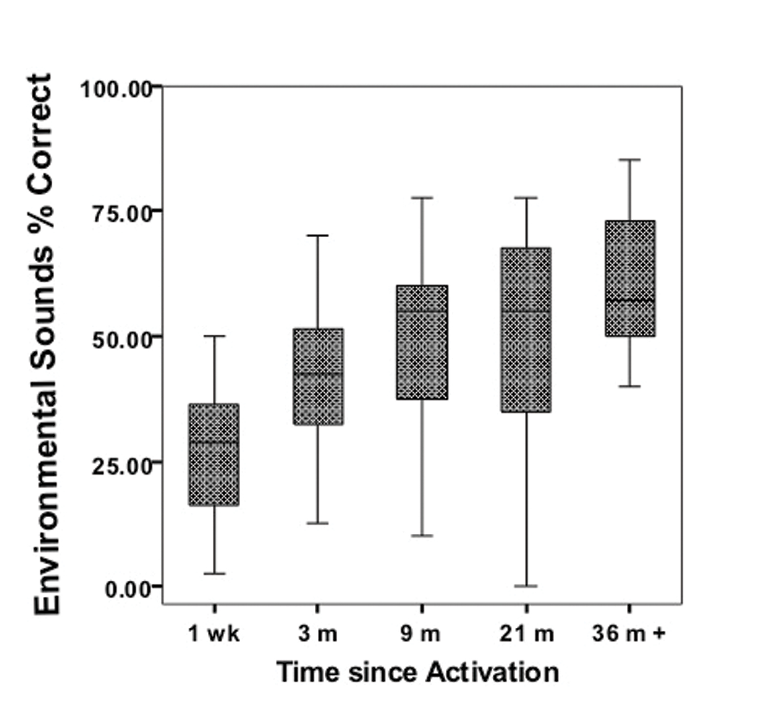 Figure 3: Environmental sound discrimination with the auditory brainstem implant (ABI) in adults and older children (n = 31). Boxplots indicating median value with inter-quartile range and the upper and lower range of measures.