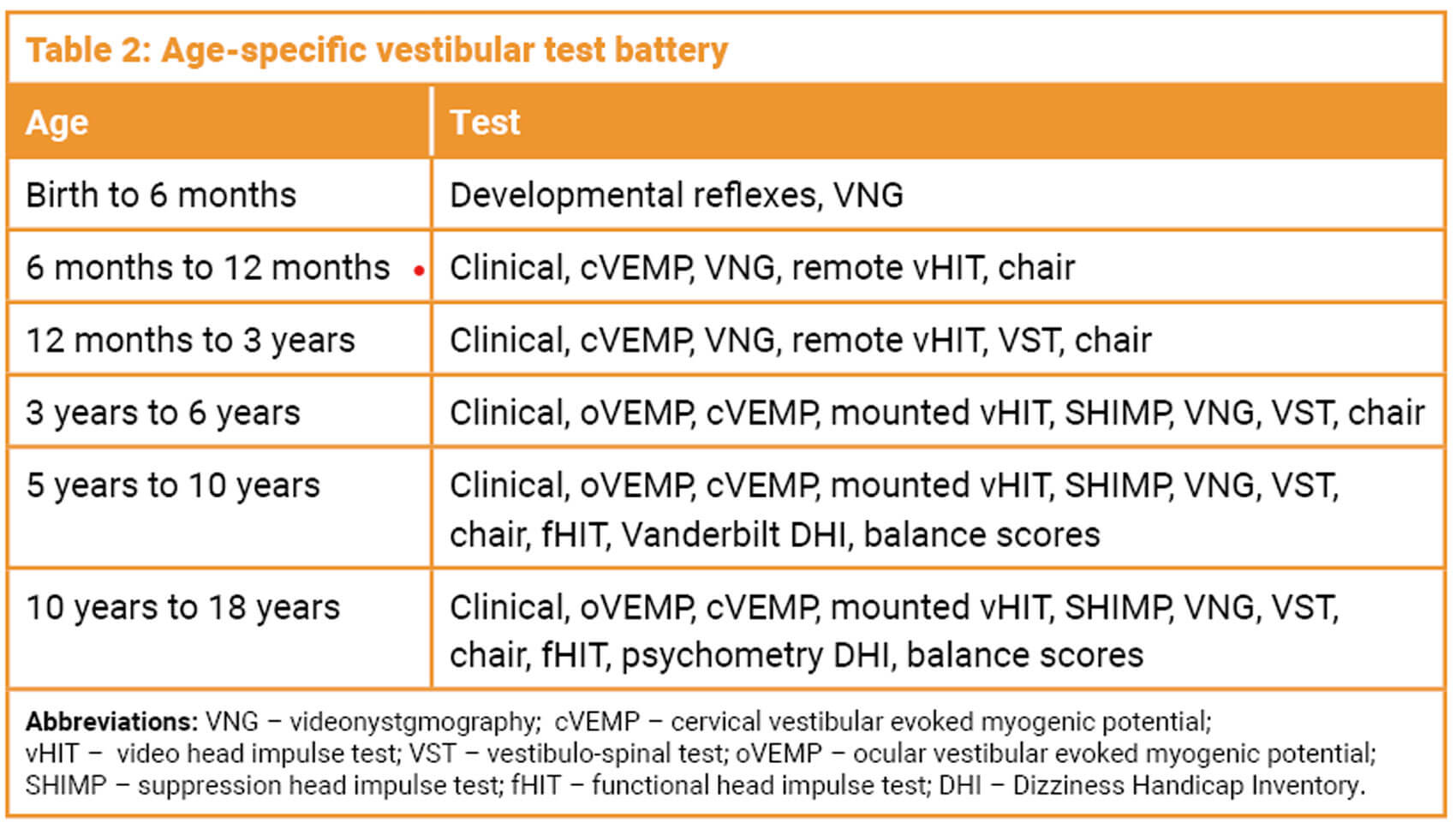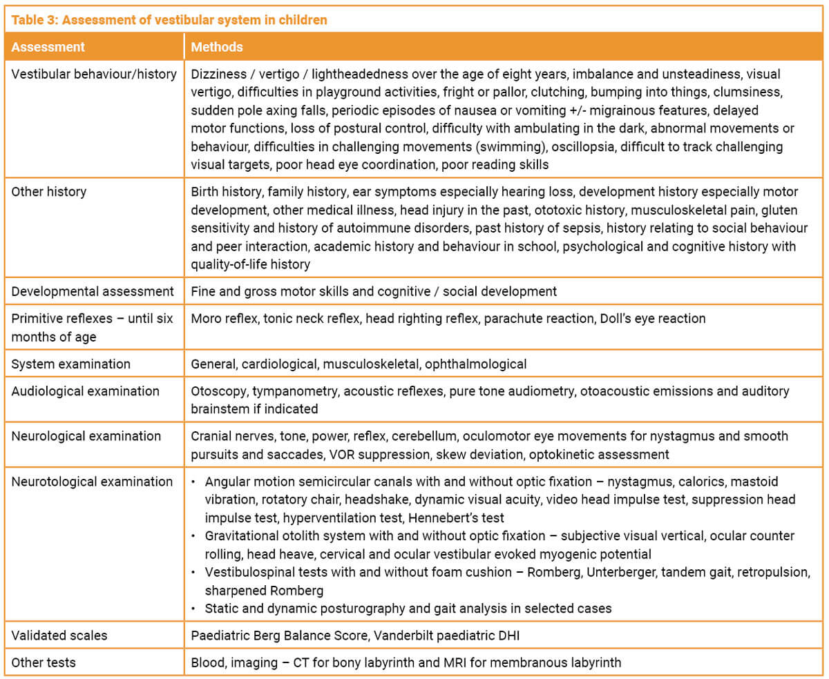 The assessment includes detailed anamnesis, multiple system examination followed by a neurotological examination and laboratory tests. Children up to the age of eight years may not be able to describe a perception of dizziness or imbalance. Eliciting vestibular behaviour from parents is thus pivotal to establish patterns for a diagnosis. In infants under the age of six years, the primitive reflexes are assessed. A clinical examination followed by objective quantification of vestibular function is required in all cases. Choice of tests to glean meaningful information is dependent on the developmental age of the child. Most tests are eminently feasible including in children with autism or attention disorders in a two-tester scenario. Removal of optic fixation and magnification of eye movements is recommended. A full audiological assessment, imaging studies and blood tests are required for determining pathology. An age-determined selection of tests is given in Table 2 and the full battery in Table 3.