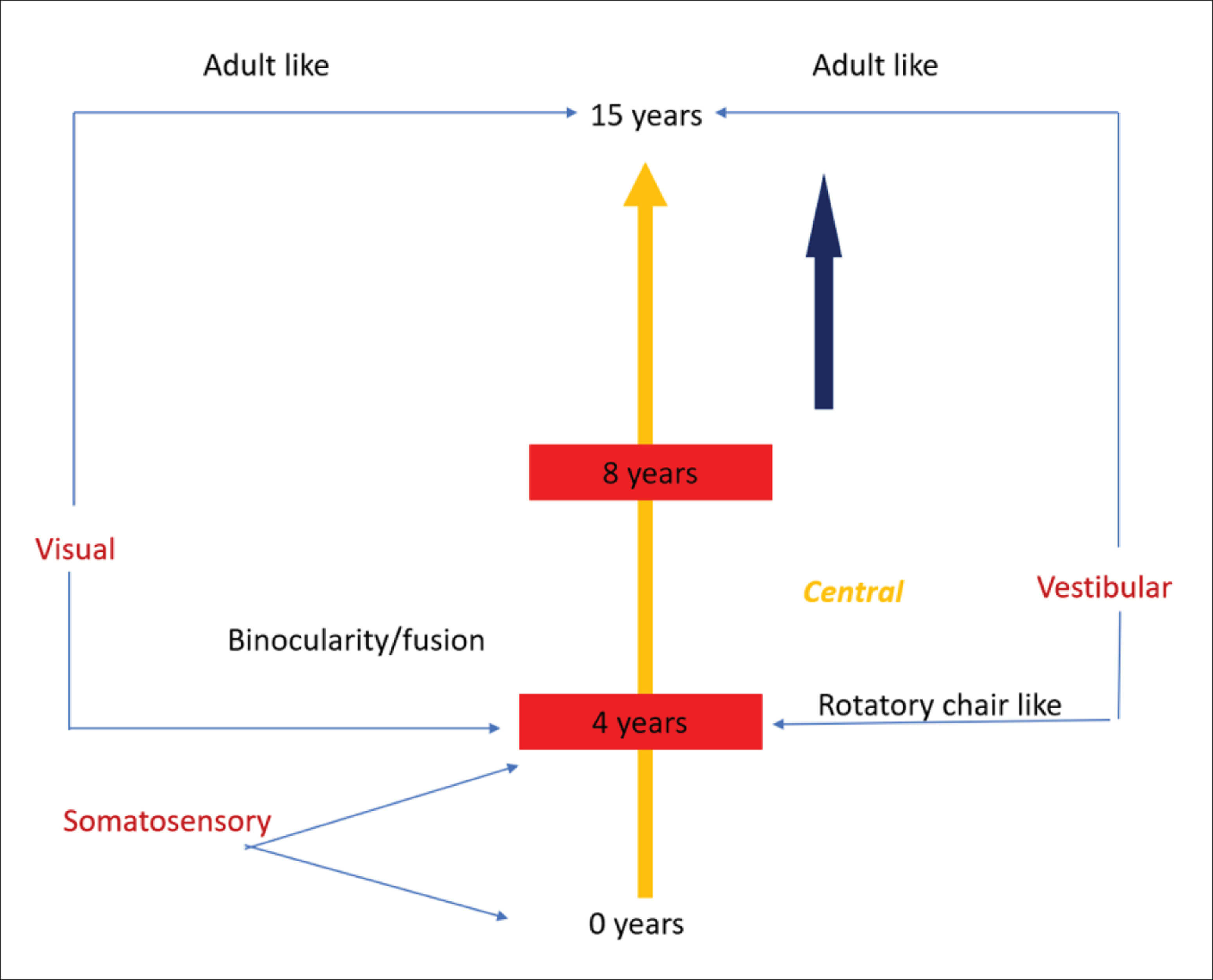 The development of the vestibular system is shown in Figure 1. Key reflexes resolving space up to six months of age are the primitive developmental reflexes [2]. The vestibulo-ocular reflex becomes functional from two months and the vestibulo-spinal reflexes mature in adolescence. Complete central vestibular integration for the final balance percept incorporating the optical system, the proprioceptive system and the cognitive centres with an eventual output to the motor system is attained at 15 years of age [3]. Knowledge about this development is essential to interpret meaningful age-specific vestibular function test battery.