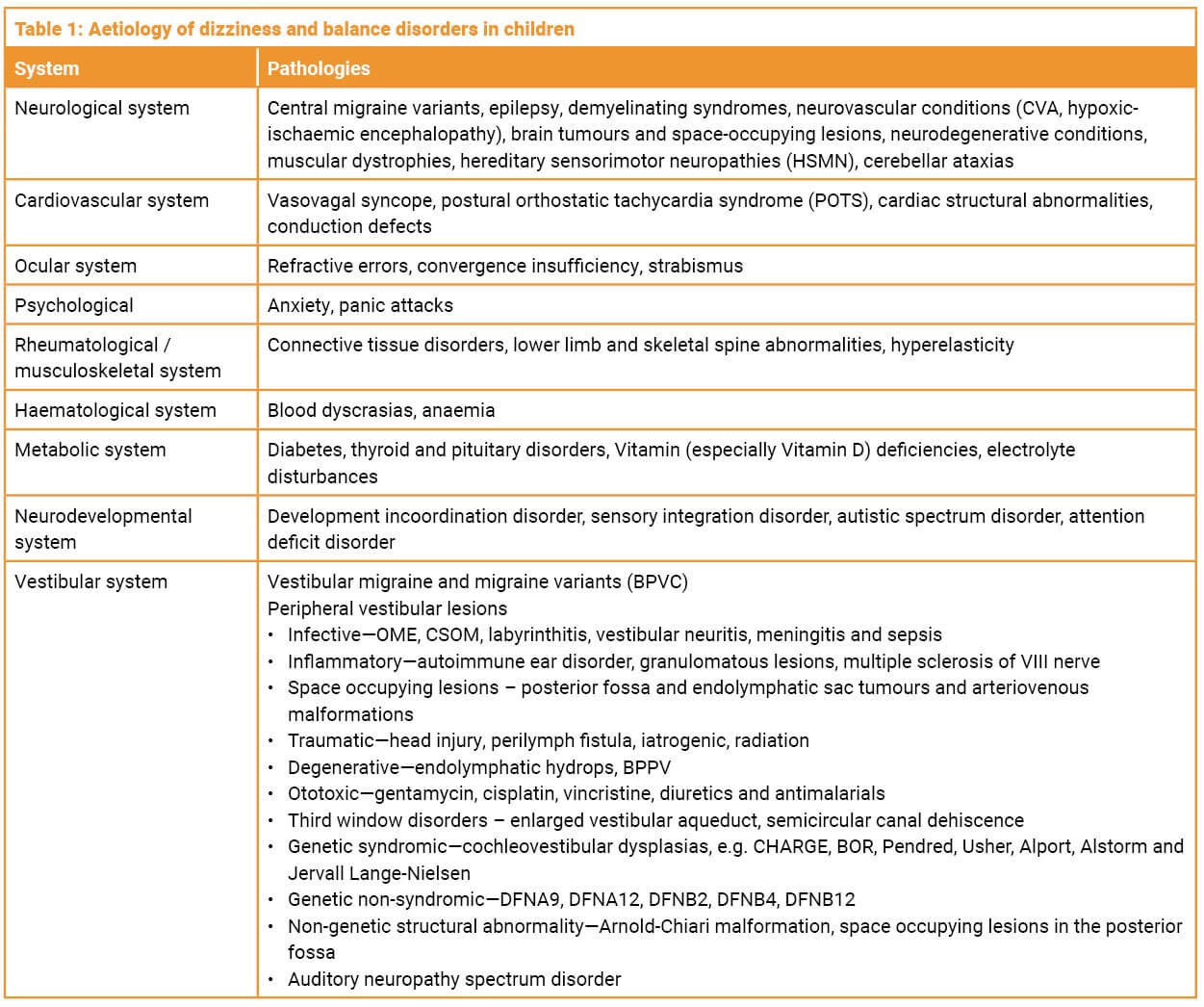 The aetiology of balance disorders in children is different from those in adults in terms of phenotype and occurrence. The causes are vast and overlap across paediatric medical disciplines. Medically inexplicable conditions, a third of development incoordination disorders and a third of sensorineural hearing losses can be accounted for or accompanied by a central or peripheral vestibular disorder. The causes are given in Table 1. The commonest cause of paediatric dizziness is vestibular migraine and, unlike in adults, viral acute vestibular neuritis, BPPV and Ménière’s disease are rare in children and are usually secondary [4].