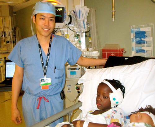 Dr Lee from the Massachusetts Eye and Ear Hospital and Elaine Mukaaya in the recovery room.