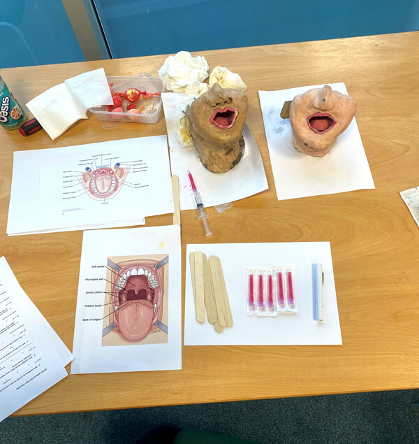 The quinsy drainage model was trialled as a station for a training day for second-year core surgical trainees (CT2) in the North-West. Feedback was again provided from a questionnaire with ratings on Likert scales of 1-7. Each of the trainees had performed the procedure several times. The confidence in their anatomical knowledge, and ability to carry out the procedure were assessed prior to and following the teaching, and both increased (means of 5 to 7, and 5 to 7 respectively). The realism of the anatomy and ability of the model to improve their confidence were also both scored highly with means of 6.3 and 6.2 respectively.