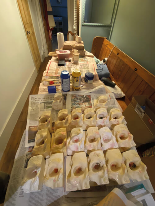 For the quinsy model, the base was sculpted from clay, the tongue from a simple dish sponge to allow depression, the soft tissue over the abscess from latex, and the abscess again from a custard-filled water balloon (Figures 3-4).