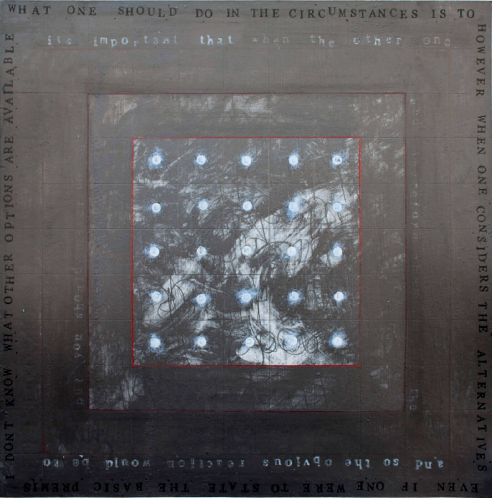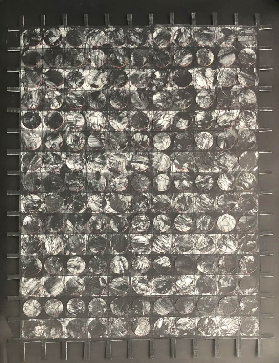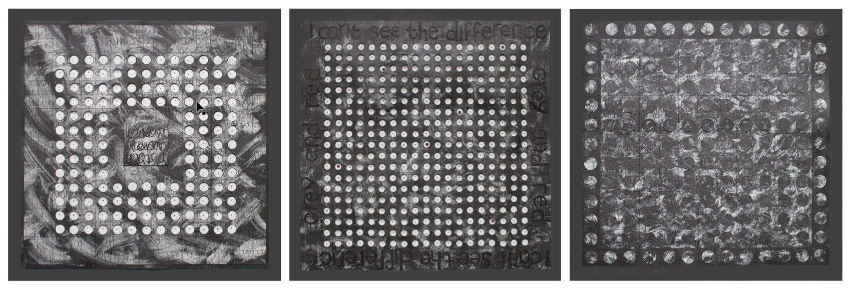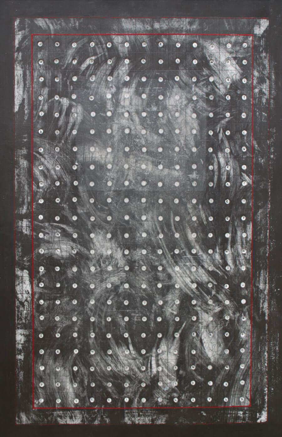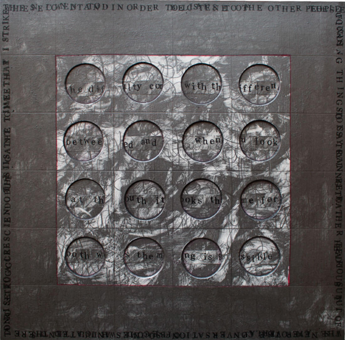 There are similarities running through the series of this work. They are all black or monochrome with just a little red. There is no compromise here - let’s hit the problem face to face. Anita was nothing if not resolute. Holes punched in the card allow glimpses of letters, a reference to typewriter keys or the perhaps perforated holes in a dated telephone or headphone.