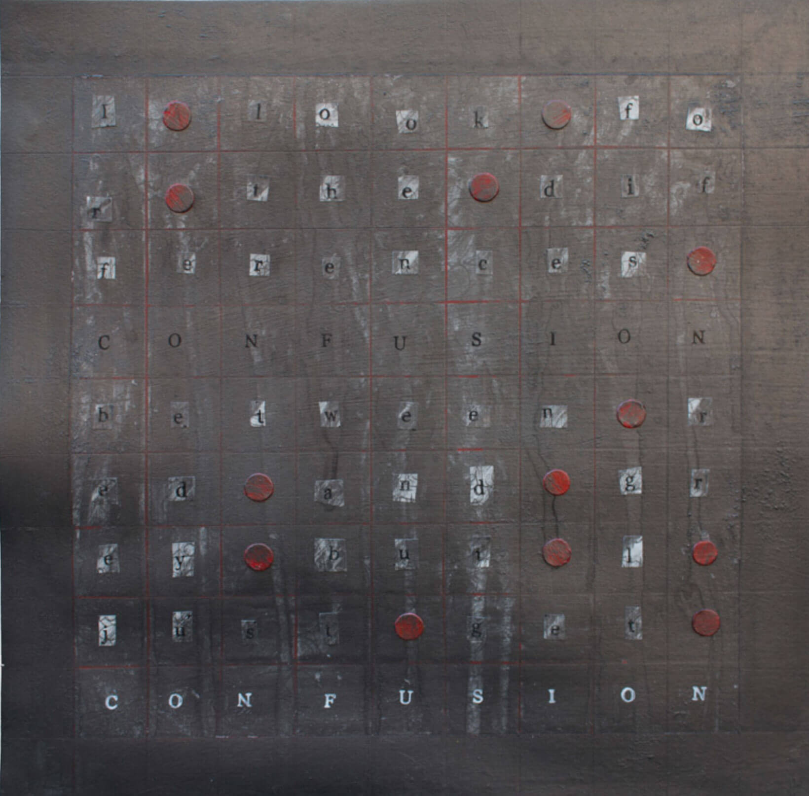 The background is fuzzy in varying degrees, sometimes completely obliterating the letters. Is this the background noise that ranges from almost unbearable tinnitus, through the sound of coexisting conversation, to the low but ever-present noise pollution of the city?