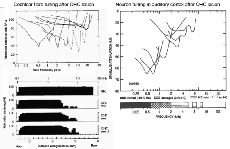 The left panel of Figure 1 shows the effects of basal outer hair cell loss on the frequency tuning properties of cochlear nerve fibres (spiral ganglion neurons) in a guinea pig model [1]. To emphasise that this is not just a peripheral problem, the right-hand panel shows tuning of neurons in cat auditory cortex after a similar cochlear haircell lesion [2]. The cortical neurons corresponding to the basal cochlear lesion show broad frequency tuning; there is no compensation for the poor frequency selectivity established at the periphery. So much auditory signal analysis and coding is achieved at the cochlear level, and when this is degraded, central mechanisms have reduced information and often have to work overtime to make sense of sounds (we might relate this to an ‘increased effort’ in hearing).