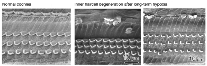 Figure 3. Effects of chronic hypoxia on the cochlear sensory epithelium in an animal model of ANSD [6]. The scanning electron microscope image on the left is from a normal animal. Centre and right images show inner haircell degeneration in experimental subjects.