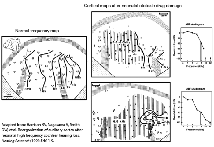 Central pathway reorganisation is most likely if a cochlear lesion exists during an early postnatal period when the auditory pathways are still developing and in a very ‘plastic’ state. The normal development of the central auditory brain depends on stimulation by an adequate pattern of neural activity from the periphery. The effects of abnormal sensory input (because of a cochlear lesion) can permanently change central auditory networks. This is illustrated in Figure 2, which shows the abnormal cortical tonotopic maps in primary auditory cortex (centre panels) that result from neonatal cochlear hearing loss. Animal models show that even in adults, a cochlear lesion can result in some modifications to cortical frequency mapping [3].