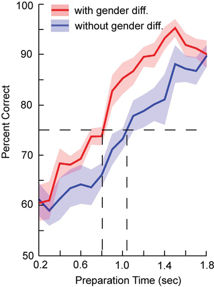Figure 1: Subject performance on switching attention task. Three talkers from different locations in the frontal horizontal plane spoke three different stories simultaneously. When the talker at centre was male and the talkers on the sides were female (red), listeners needed about 0.8 second preparation time to switch attention effectively enough to get 75% questions correct from the new target story. This was shorter than the approximately 1 second preparation time needed to switch attention among three female talkers (blue).