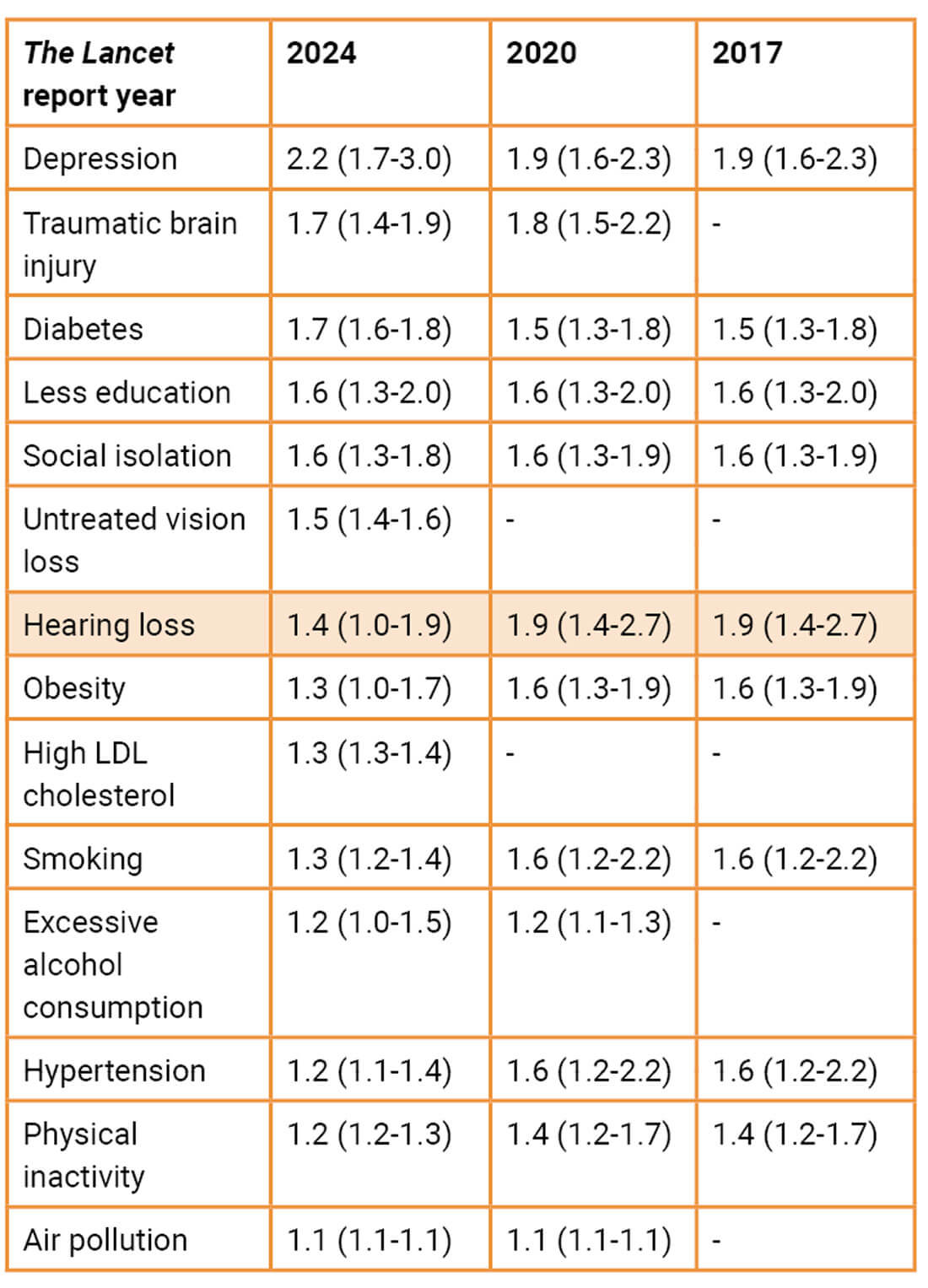 3. Personal risk. The risk to an individual with hearing loss is reported as a relative risk (RR; the probability of developing dementia with hearing loss divided by the probability without hearing loss). However, many in our profession misuse the weighted population attributable fraction (PAF; the reduction in dementia cases that would occur if exposure to a risk factor was completely abolished) to demonstrate personal risk. The RR for the various potentially modifiable risk factors identified in the report are shown in Table 1. The report explains that removing the risk (e.g. minimising diabetes and reducing air pollution) may reduce neuropathological damage or increase and maintain cognitive reserve. This is not a competition to identify the factor with the highest RR, but we have ranked the factors in Table 1 according to the 2024 risk estimate to illustrate trends. For example, less education (a potential risk because of less cognitive reserve and less cognitively stimulating occupations) has remained unchanged over time. On the other hand, RR for both depression and diabetes has increased. Importantly, for those working in audiology, the biggest reduction in RR is for hearing loss, down from 1.9 to 1.4, based largely on the review by Yu et al [4]. The reason for the reduction in RR estimates for hearing loss is because of the inclusion of additional studies modelling dementia risk associated with hearing loss that included more extensive control for potential confounds.