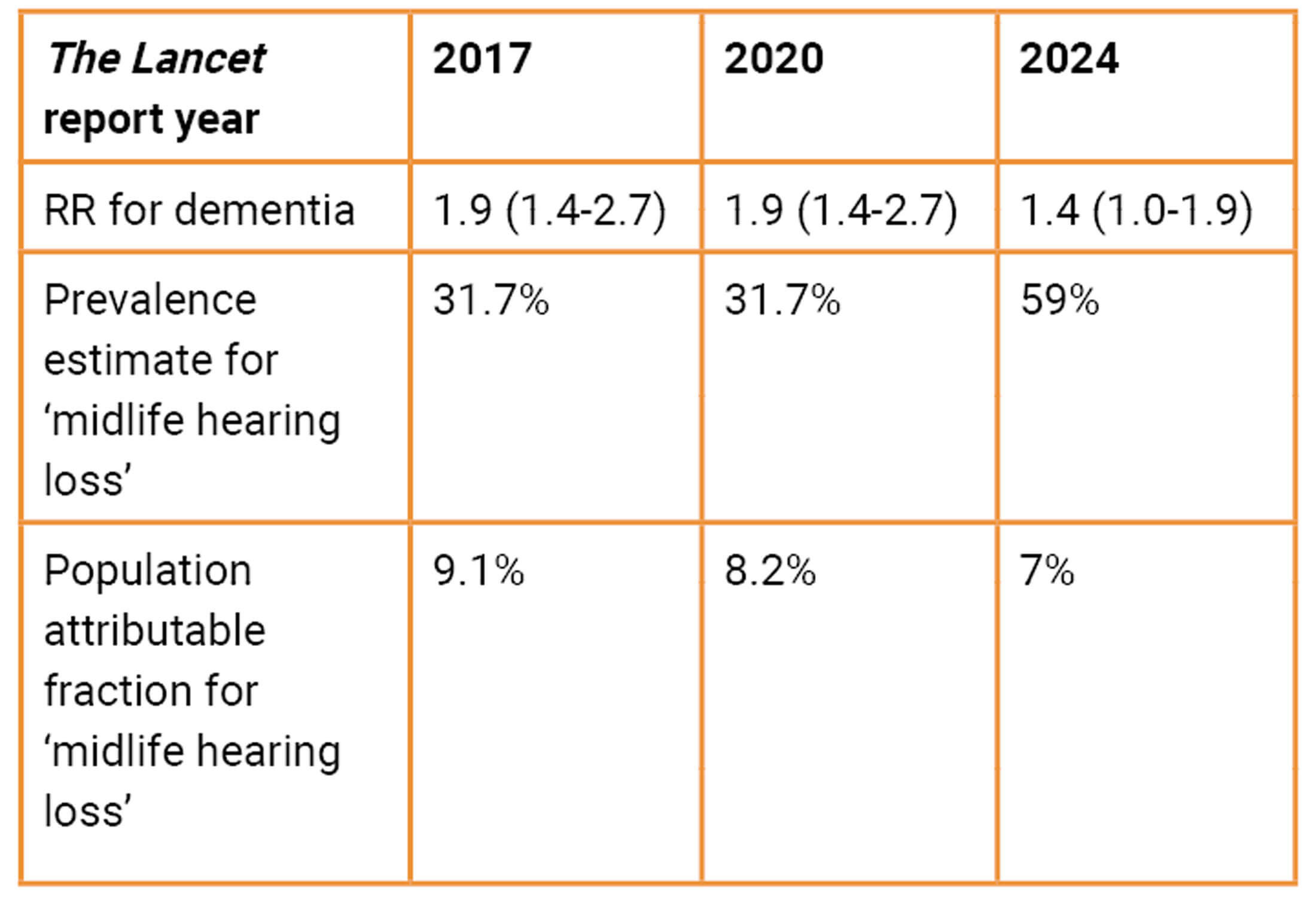 - The 2017 and 2020 reports estimated the size of the population with ‘midlife hearing loss’ to be 31.7%. The 2024 report provides a substantially increased population estimate of 59% without any explanation for the increase (see Table 2). It is not clear that 59% is a realistic estimate of the proportion of the general population that is relevant to hearing loss as a ‘potentially modifiable risk factor’. The PAF would be considerably lower than 7% if the 2017 prevalence estimate of 31.7% had been used.
