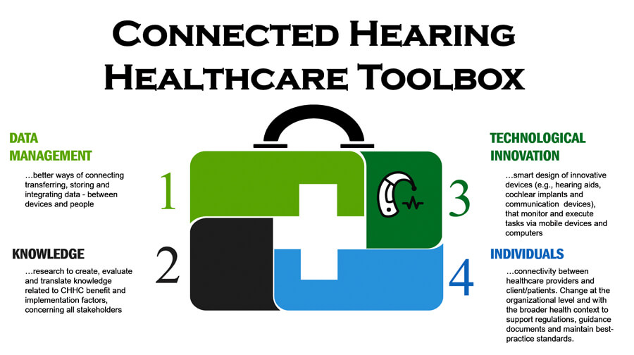 Instead of just using a single medical device to treat an isolated condition, the ideal form of this service delivery model could function using a shared-medical economy model that provides services on an as-needed basis while also accruing information that helps enhance treatment for chronic conditions such as hearing loss. CHHC will require the healthcare provider (HCP) to interface with cutting edge technology to not only enhance the quality of their services to their clients/patients, but also to improve the treatment experience/outcome, using a person-centred service delivery approach. Figure 1 illustrates a toolbox of essentials in the CHHC model.