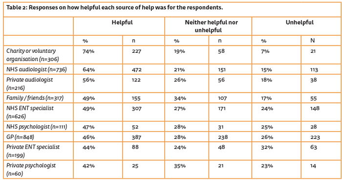 One of the points frequently made was that the professionals in the audiology clinic focused on the hearing loss rather than the tinnitus: “It’s more about giving me hearing aids than treating tinnitus.” However, audiologists (both private and NHS) and charity or voluntary organisations such as the BTA were the only sources of support that the majority of respondents rated as “helpful” which may indicate that when tinnitus is considered and managed along with hearing loss, the intervention will be beneficial and patient satisfaction will be correspondingly higher (Table 2).