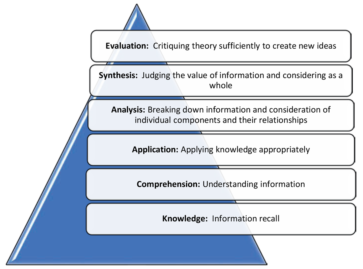 When documenting CPD, professional bodies and organisations responsible for state registration may have a format that they recommend which makes auditing easier and there is an increasing expectation that learning is not recorded simply by a list of course titles and dates, but by a series of reflective pieces. This develops the learners’ critical and self-awareness skills. It also helps the learner identify benefits and short comings of the learning which assists in planning the next step. Regarding the depth of knowledge required, there is a hierarchy of learning called Bloom’s Taxonomy, paraphrased in Figure 1.