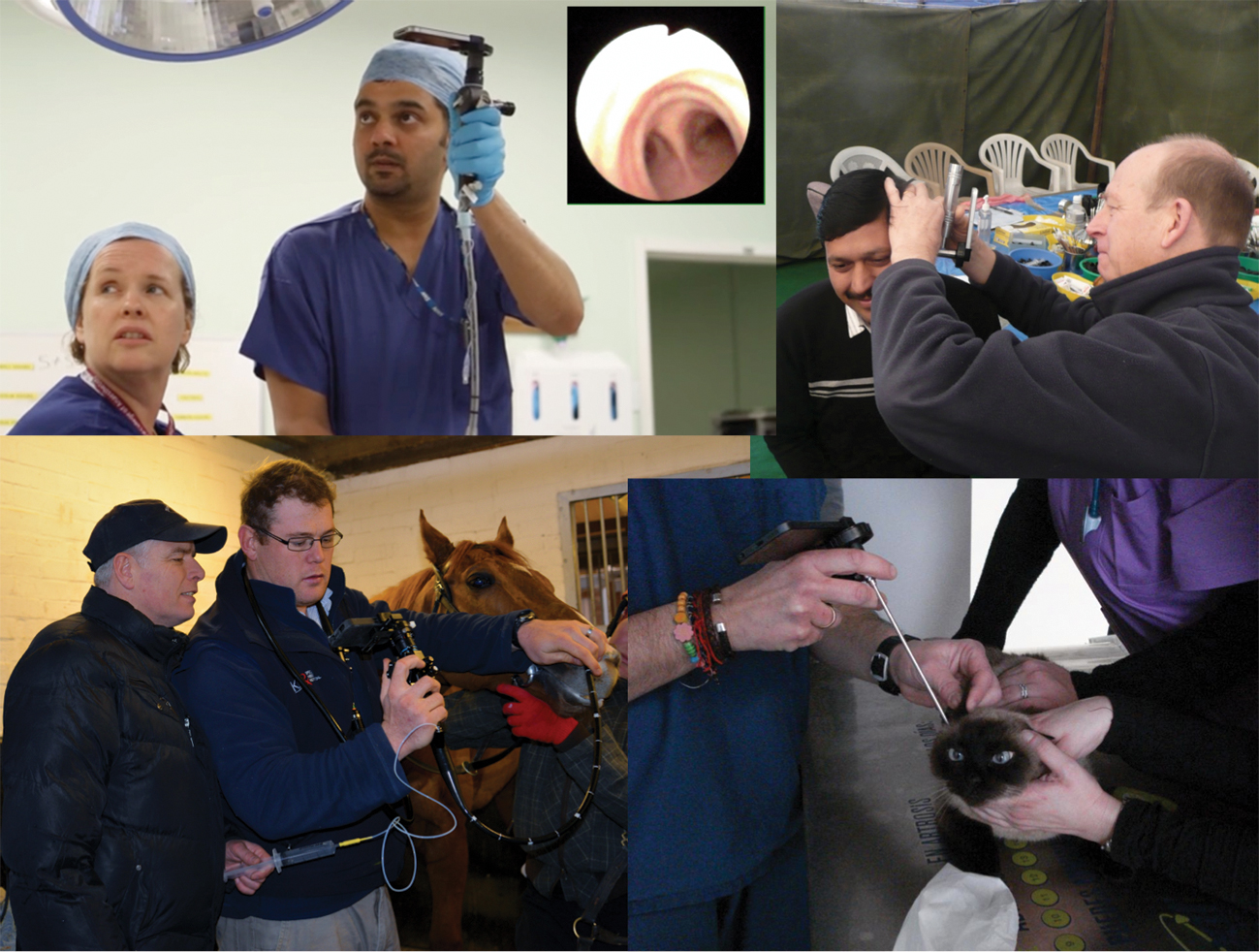 Figure 2a: From top left clockwise: Dr Ajit Bhat performs iPhone fibreoptic intubation as a colleague watches the streamed live video on the HD monitor (the carina on inset), Mr Mike Smith at the Nepal ear camp, Dr Francisco Martinez Gomariz performing feline iPhone otoscopy and Dr Lewis Smith performing equine iPhone laryngoscopy.