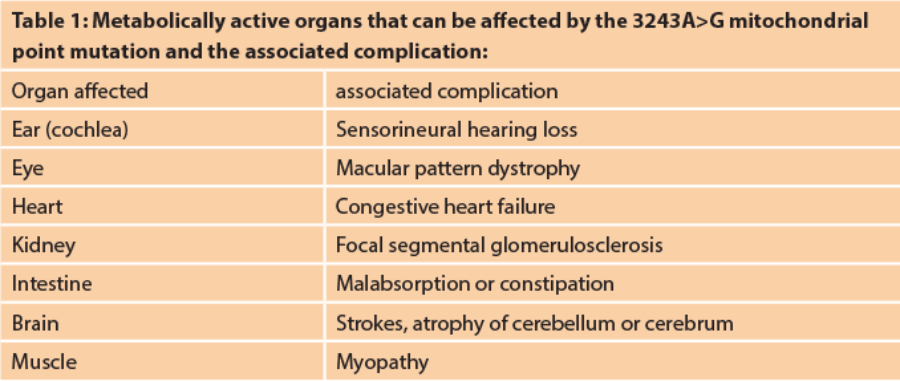 13. Murphy R, Turnbull DM, Walker M, Hattersley AT. “Clinical features, diagnosis and management of maternally inherited diabetes and deafness (MIDD) associated with the 3243A>G mitochondrial point mutation.” Diabet. Med 2008;25(4):383-99.