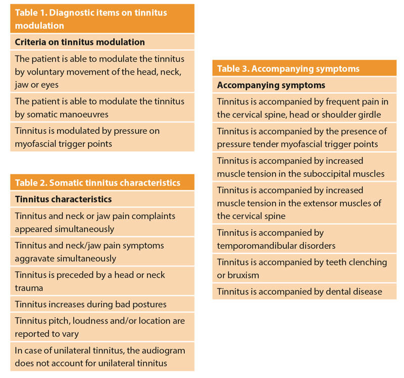 Since 2018, a set of 16 diagnostic criteria exists that, when present, strongly suggest a somatosensory influence on the patient’s tinnitus [3] . The criteria are presented in Tables 1 to 3. To prevent under or over-diagnosis, it is important to keep in mind the authors’ footnotes. When looking at the ‘modulation’ items for instance, the authors recognise the importance of somatic modulation, especially by voluntary movements, for the ST diagnosis, but add that the absence of this ability does not rule out ST. Hence, somatic modulation should not be used as a simple ‘yes/no’ criterion for diagnosing ST. Although the use of somatic manoeuvres to assess tinnitus modulation is included in the list, experts believe that the use of these manoeuvres as a single criterion can potentially lead to over-diagnosis.