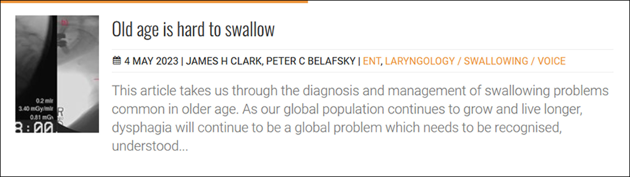 Dysphagia, or difficulties eating, drinking and swallowing, is a difficult condition to manage in any clinical population, impacting on health and quality of life. The importance of this area of clinical practice is reflected by an ever-increasing body of literature. For clinicians working in the field of complex laryngology, this is especially true.