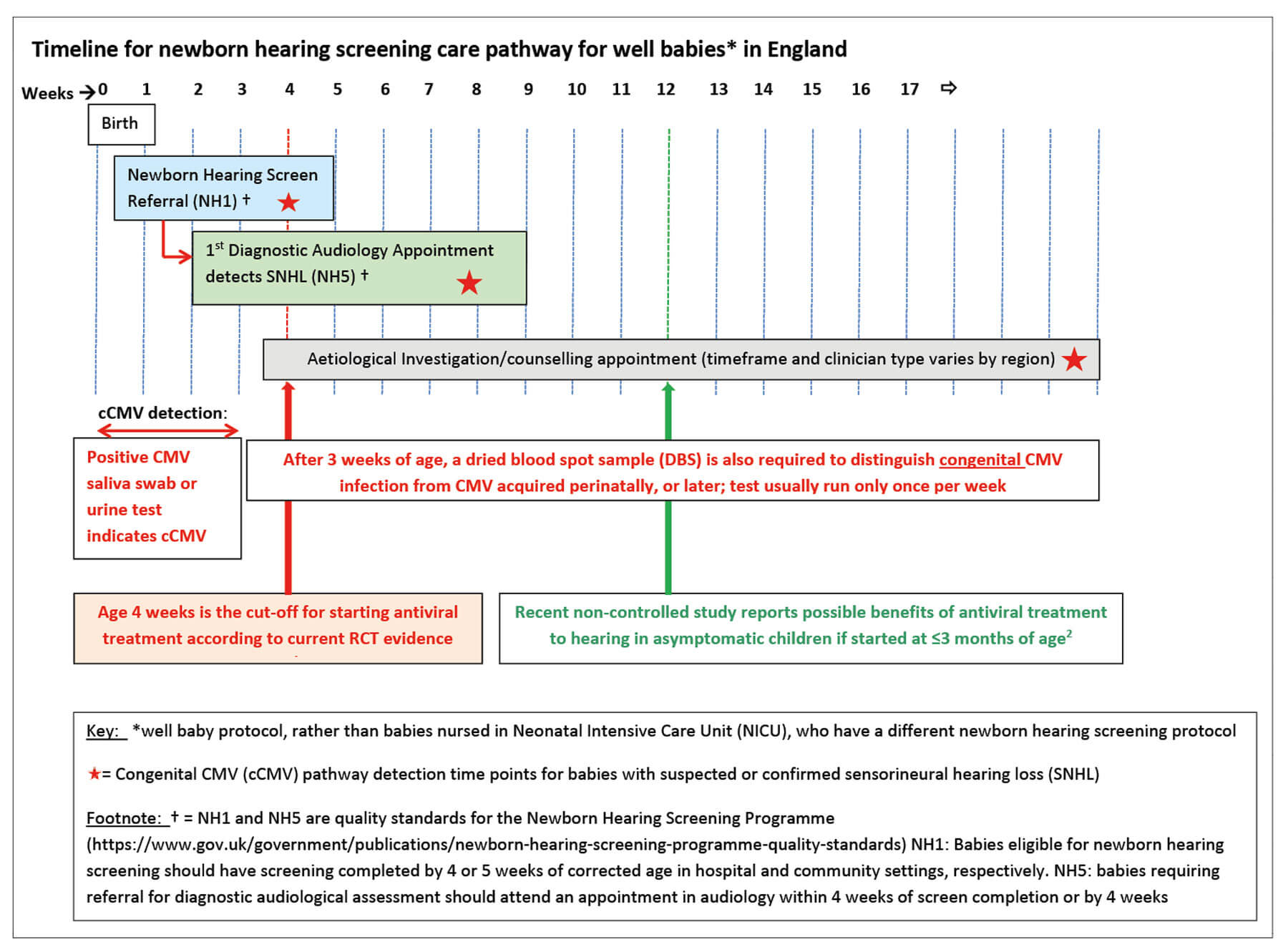In the UK, the newborn hearing screen is completed shortly after birth, and by age four weeks in the hospital setting or five weeks in the community setting (Figure 1). If the hearing screen, audiological assessment and CMV tests are done early enough, treatment can be initiated in time, provided the process is efficient and rapid.