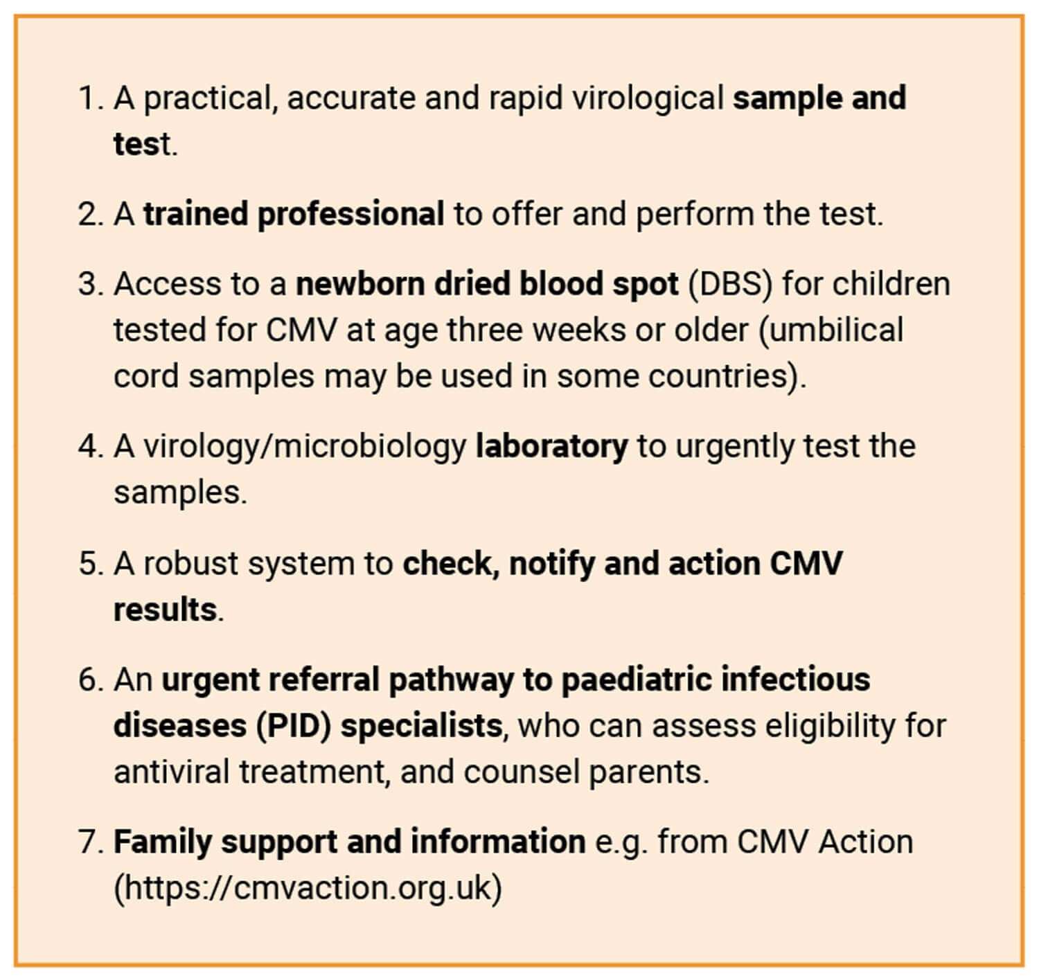 CMV screening tests are mandatory in newborns with hearing loss in some states of the USA, to avoid missing the treatment window. Missing cCMV has become an area for litigation. The NICE-approved aetiological investigation guidelines written by the British Association of Audiovestibular Physicians include timely investigations for cCMV (see www.baap.org.uk). The British Academy of Audiology Quality Standards in Paediatric Audiology states services must have clearly defined pathways and protocols for early cCMV diagnosis (see www.baaudiology.org). Early detection and management of major causes of hearing loss are also a WHO priority (see World Report on Hearing www.who.int/publications/i/item/9789240020481).
