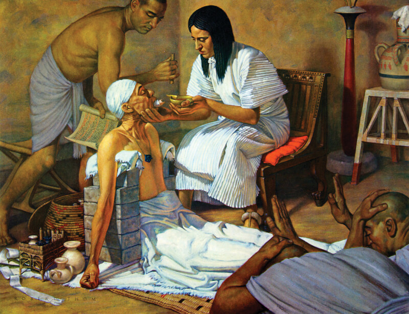 Medicine in ancient Egypt. An Egyptian physician (1500 BC) treats a patient for lockjaw in accordance with directions on a papyrus scroll, while priests perform prescribed rites. Egyptian medicine occupied a dominant position in the ancient world for 2500 years. One of a series: A History of medicine in pictures by Parke, Davis & Company, 1957, painted by Robert A Thom.