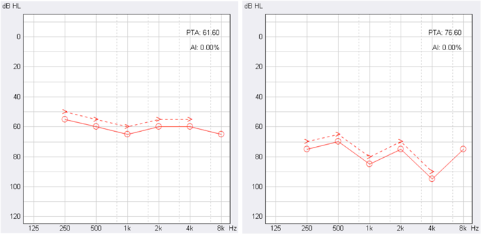 It is noticeable that the asymmetrical audiogram pattern (in terms of degree, type and pattern of hearing loss) is more common than the symmetrical pattern (70% versus 30% of cases for asymmetrical and symmetrical, respectively). The asymmetry in an audiogram is caused by the effect of head shadow - the near ear is more susceptible than the far ear (Figure 4).