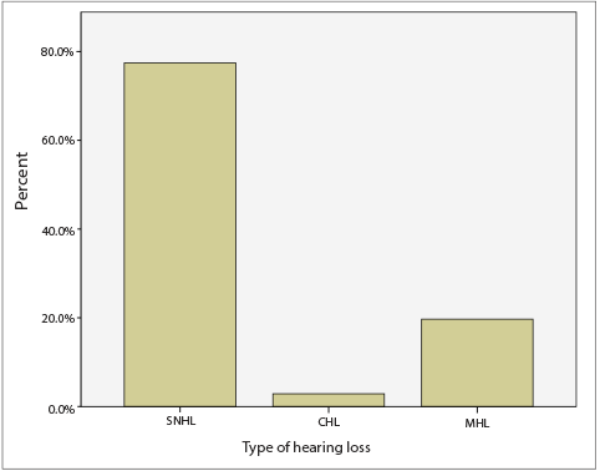 The types of hearing loss among war veterans are different. As shown in Figure 2, sensorineural, mixed and conductive hearing losses are present from high to low rates (nearly 80%, 18% and 2%, respectively). The majority of tympanic membrane perforation is a result of blast wave, rather than acoustic trauma.