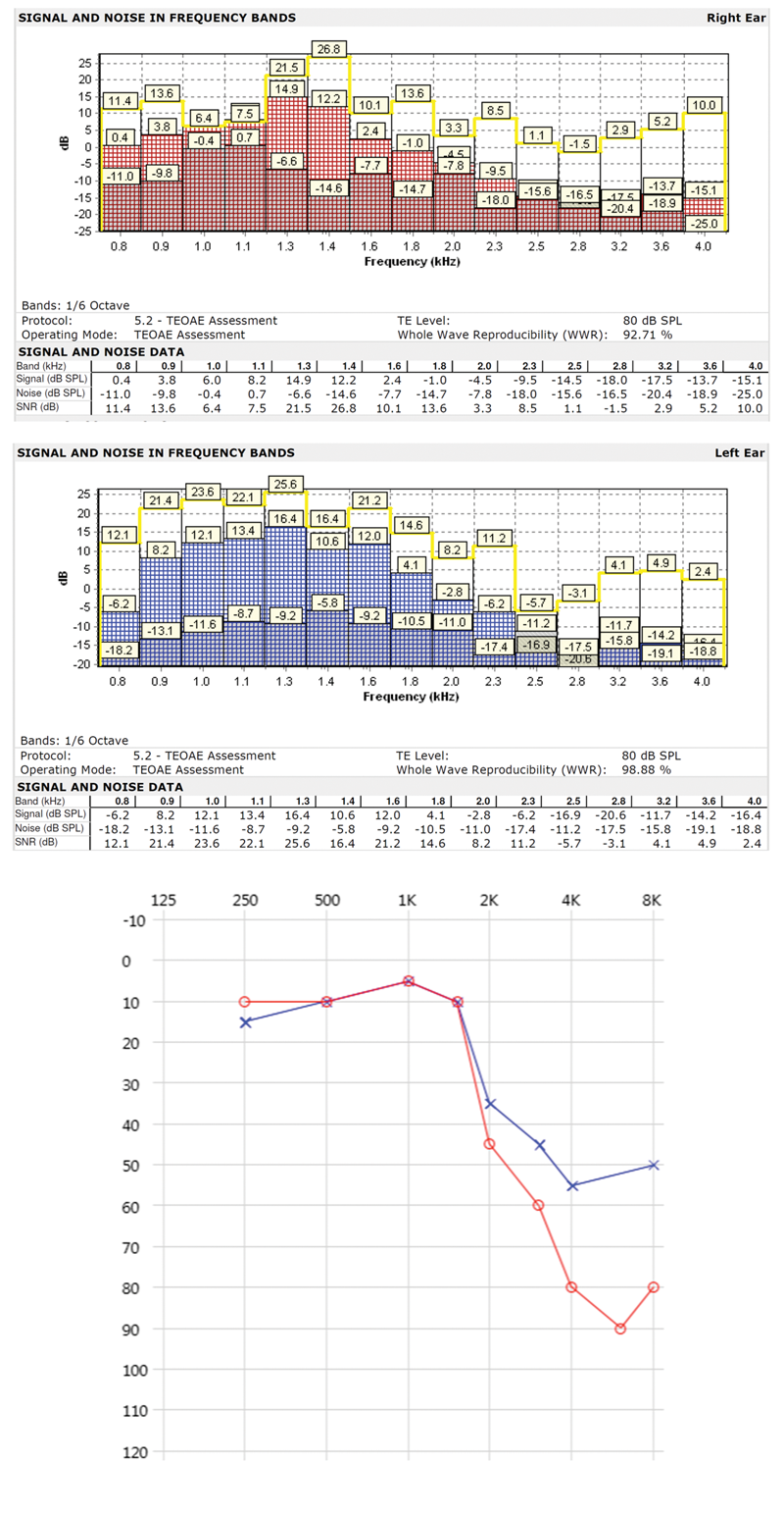 In line with the above speech in noise results, the fact that transient-evoked otoacoustic emissions (TEOAEs) are not present in nearly all veterans with hearing loss suggests loss of outer hair cells because of blast wave or acoustic trauma. Since the outer hair cells have an important role in frequency resolution and discrimination, especially for exctracting the speech signals from background noise, loss of outer hair cells causes a lower score in speech perception in noise tests. For example, in Figure 6, it can be seen that there is not any reliable TEOAE in high frequency ranges (2 kHz and higher) which is corresponding to audiogram configuration.