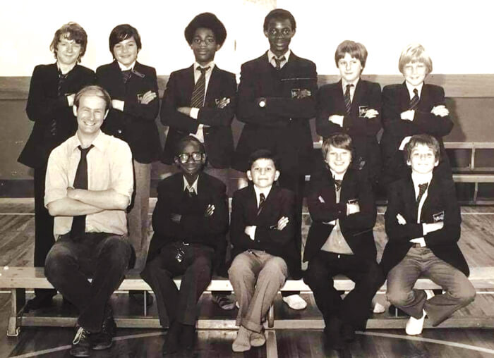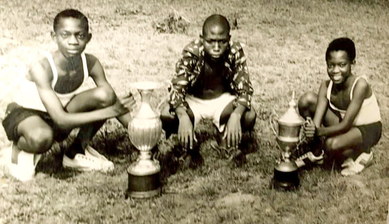 Brian at boarding school in Nigeria before his hearing loss, posing with the athletics trophies.