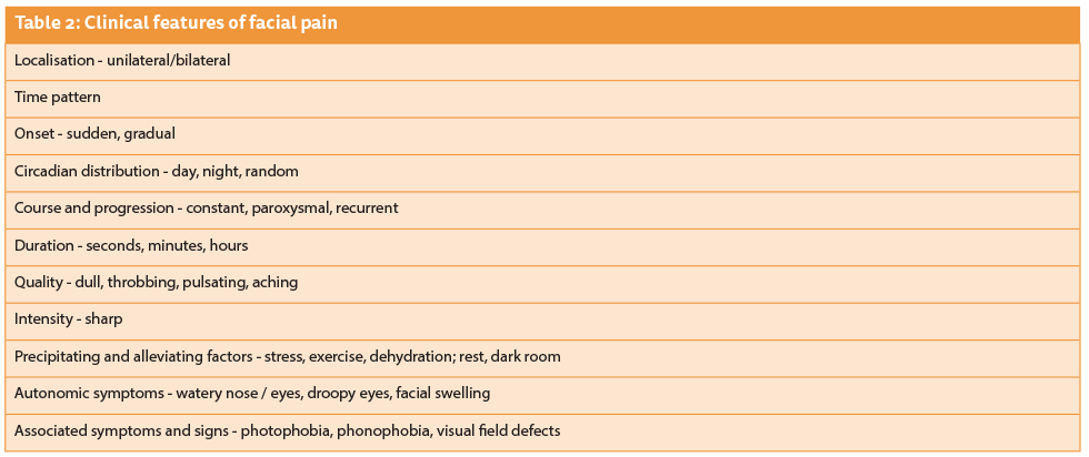 History taking should include the points mentioned in Table 2. A thorough head and neck examination should be performed including testing of the cranial nerves, palpation for points of tenderness and trigger points, jaw clicks and dental pain. A neurologic examination should also be performed. If a rhinogenic source is a concern, nasal endoscopy looking for purulence, oedema, inflammation, trauma and tumour should be performed.