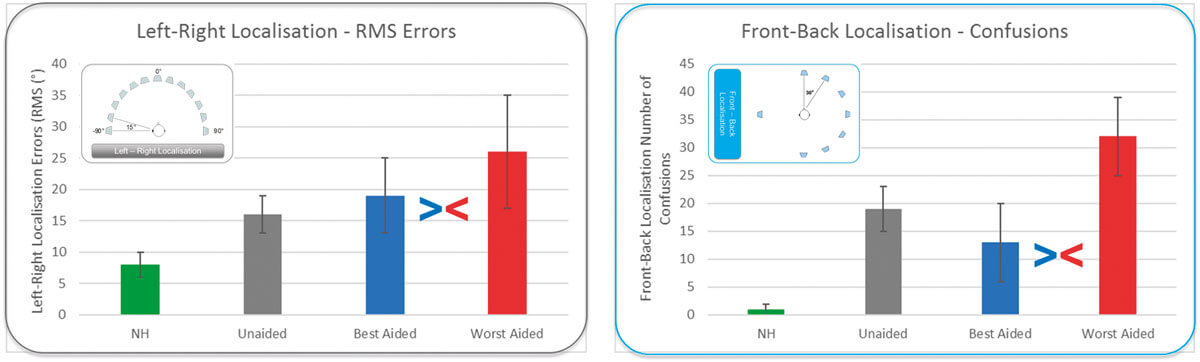 Carette et al [1], conducted a study in which localisation performance was evaluated with multiple direction signal processing schemes. As can be seen in Figure 1, both for left-right and front-back localisation, the difference in performance between the best and worst direction schemes are substantial.