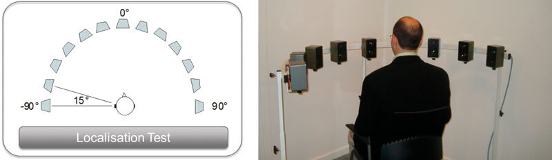 Since central auditory processing and localisation capacity are important, both in the pre-fitting and post-fitting assessment and verification, this needs to be incorporated in the fitting protocol. This can be done by performing a localisation test using an array of at least seven loudspeakers in a semi-circle (see Figure 3).