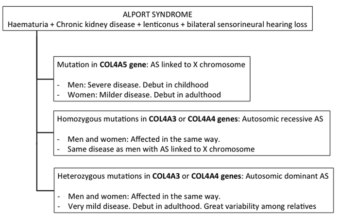 As has three different patterns of inheritance, which generate three different entities: AS associated to the X chromosome (OMIM 301050) in 80% of cases, caused by mutations in COL4A5 gene; autosomal recessive AS (OMIM 203780), which is caused by homozygous mutations in COL4A3 or COL4A4 genes, and appears in 15% of cases; and autosomal dominant AS (OMIM 104200), which is the result of heterozygous mutations in COL4A3 or COL4A4 genes and is diagnosed in the remaining 5% of patients (Figure 1). In all of these cases, mutations of the corresponding genes prevent the production of the proper type IV collagen network, which generates the clinical expression of the disease [1, 2]. So the main symptom is haematuria, which progresses to chronic renal failure and dialysis.