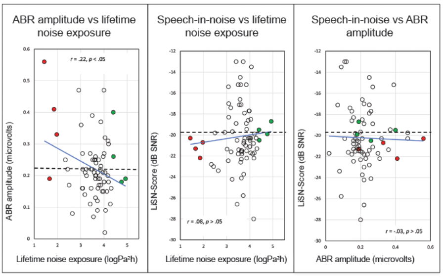 Although our electrophysiology results provide some evidence of cochlear synaptopathy in humans, the results were highly variable and the relationship between lifetime noise exposure and ABR amplitude was neither consistent, nor predictable. To illustrate the variability, in Figure 1, we have coloured the four subjects with the lowest noise exposures in red, and those with the highest noise exposures in green. Panel A shows that those with the lowest exposure had ABR amplitudes that ranged from a below-average 0.19 to 0.56 microvolts (the highest amplitude in the sample). The ABR amplitudes of the subjects with the highest levels of noise exposure were across a similar range (0.18-0.40 microvolts). When speech-in-noise performance is plotted against noise exposure (panel B) and ABR amplitude (panel C) there is no discernible relationship: those with higher and lower noise exposures and / or ABR amplitudes perform at or near-average levels on the speech-in-noise task, rather than at the upper and lower extremes that one would have expected.