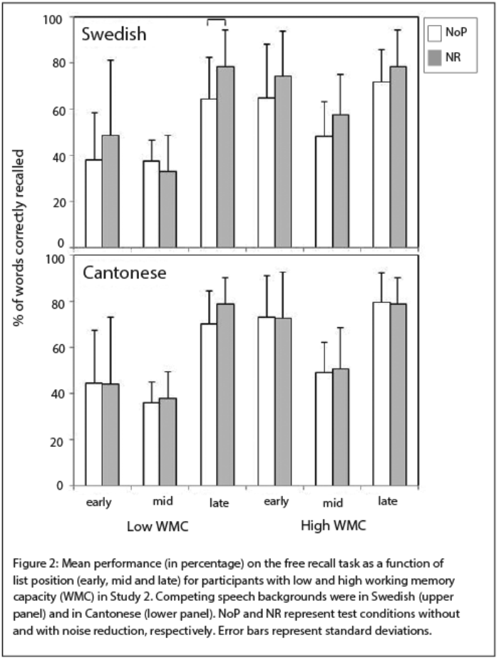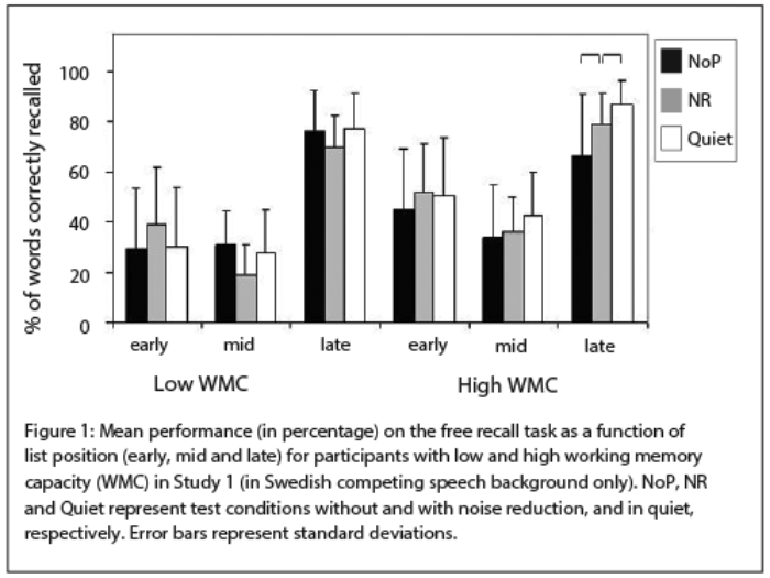 Competing speech may be more detrimental to recall performance than stationary noise because the lexical information in competing speech was more distracting [8] and was harder to segregate from target speech [9]. Segregation of target words from background noise may be facilitated when there is noise reduction. This would allow more rapid and accurate word identification and enhance encoding of words into working memory [10]. Importantly, the results of this study also showed that the effect of signal processing on memory depends on individual differences in working memory capacity.