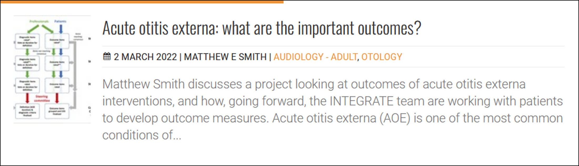Common causes of outer ear pathology include infections, foreign bodies and trauma. One of the key differences common to all causes of ear disease involves time to presentation. In the UK, patients may seek advice from their GP or emergency department relatively early in the disease and it is not uncommon to see patients displaying acute symptoms of ear pain or discharge for only a few days.