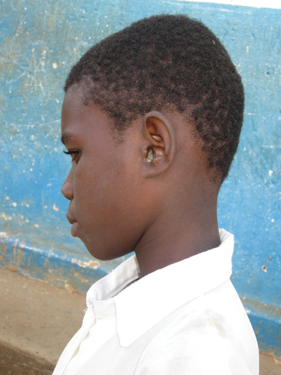Dr Mwannana, audiologist, with two new hearing aid wearers.