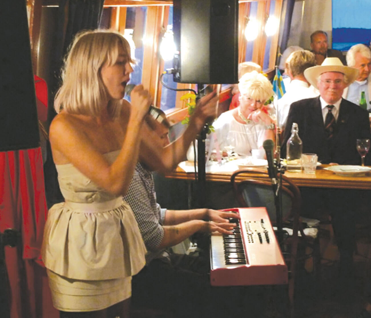 A dapper Helge with straw hat, pictured with his sister, celebrating his 60th birthday on a boat trip on the Fyris River in 2010. In the foreground is celebrity rock star and family member, Veronica Maggio.