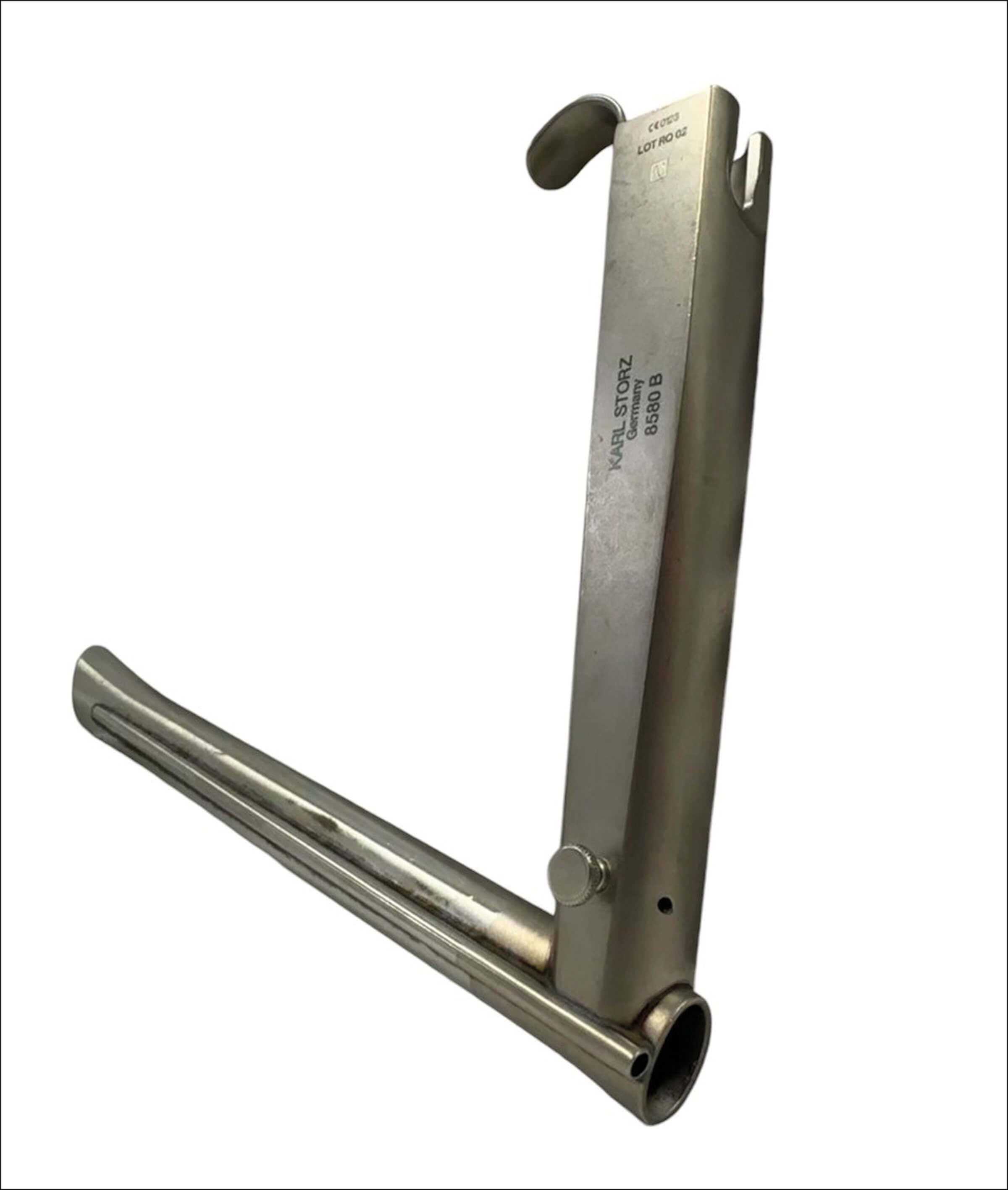 12. Place the laryngoscope in suspension. Use assistance to attach the suspension arm prior to the operating surgeon tightening the angle whilst checking the view.