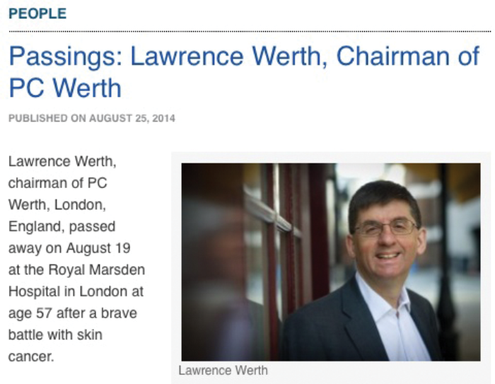 In August the audiology community was saddened to learn that Lawrence Werth (57), Chairman of PC Werth Ltd, London had passed away after a brave battle with skin cancer. A prolific contributor to this magazine over the years, he is remembered here by friends and colleagues who reflect on his unique personality and his contribution to the hearing care community.